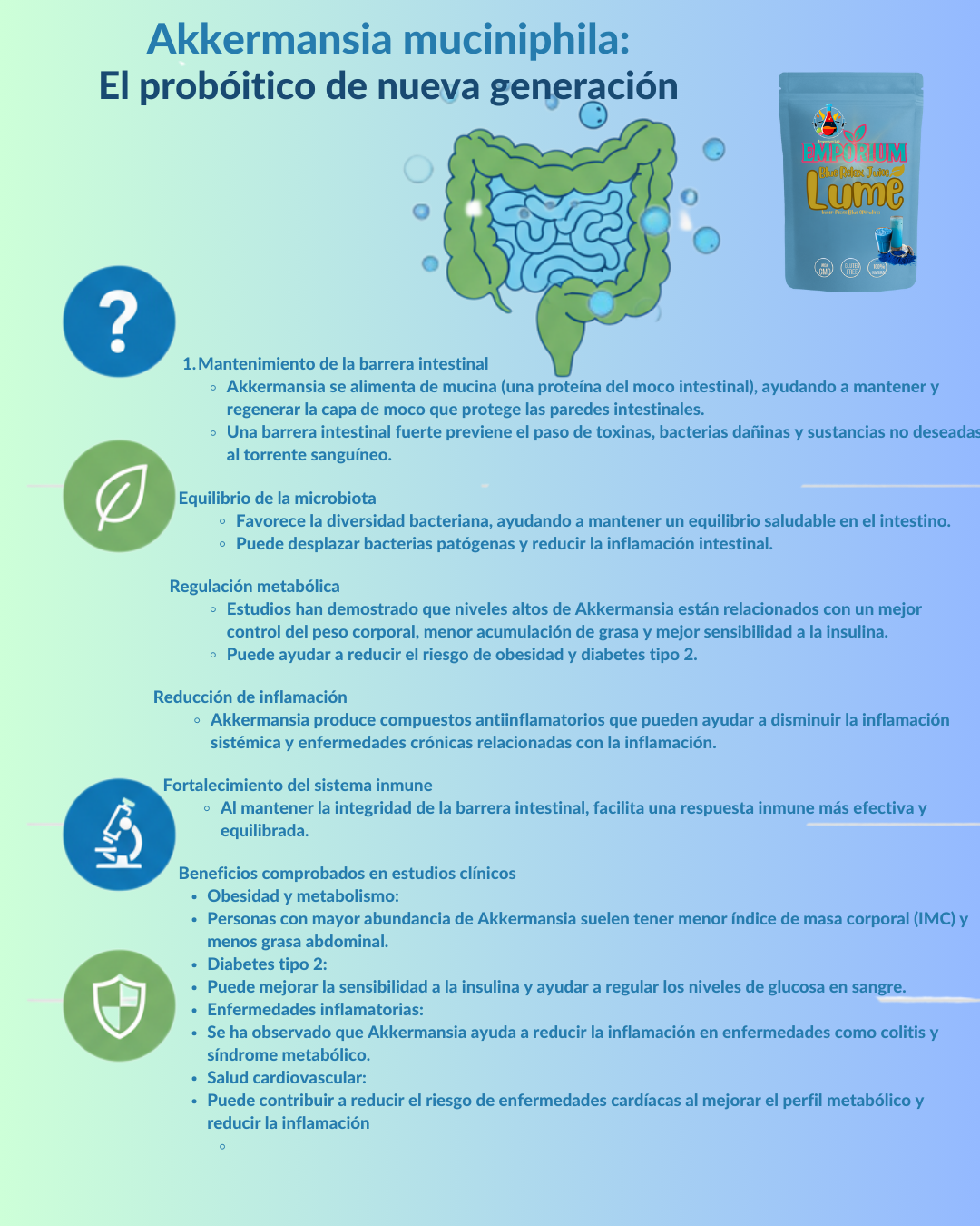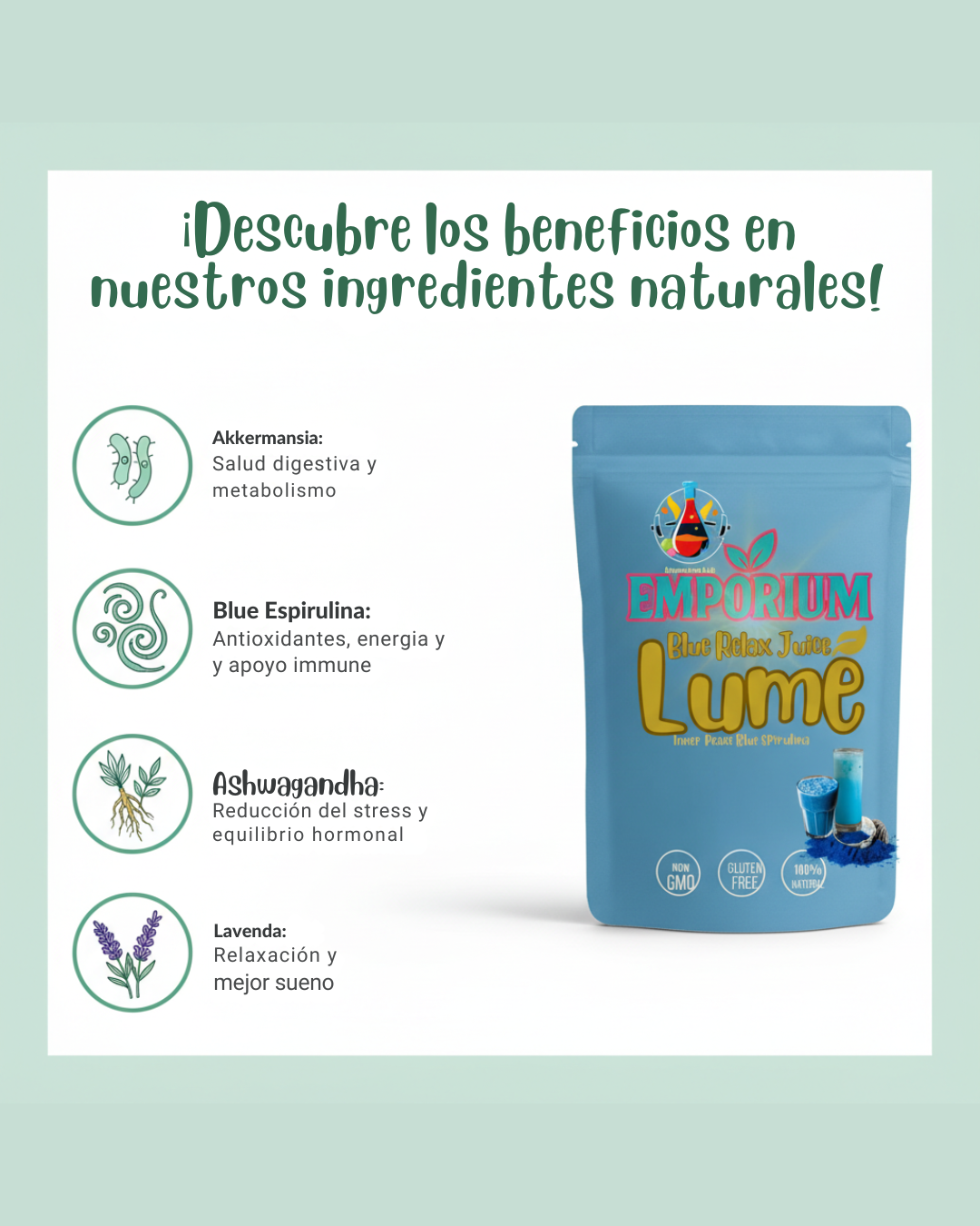 Su vibrante color azul refleja su alto contenido en ingredientes naturales como espirulina, conocida por su riqueza en antioxidantes, combinada con ashwagandha y lavanda, que ayudan a promover la calma, el balance y el bienestar general. Además, contiene el probiótico Akkermansia, reconocido por su apoyo a la salud intestinal y metabólica.